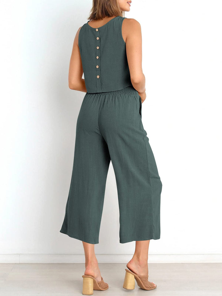 - Features - 2 piece outfits, sleeveless round neck crop top, wide leg cropped pants, button back, high waist, wide waistband.