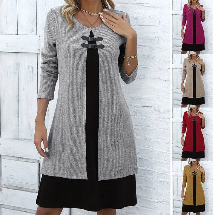 Step into timeless sophistication with this beautifully crafted dress. Designed with a clever layered look and a graceful round neckline, it offers the elegance of a two-piece ensemble with the ease of one. Perfect for office wear, dinners, or any special occasion.